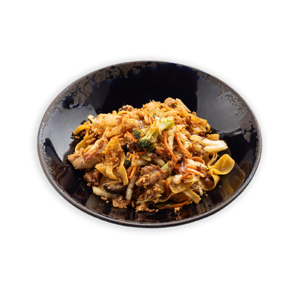 Su marinuota vištiena, kepintomis morkomis, šitakiais, kininiais kopūstais, brokoliais, baltaisiais ridikais, svogūnų traškučiais, laiškinio česnako žaluma.