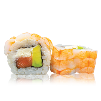 Krevetės sushi ebi, lašiša, avokadas, sūrio kremas