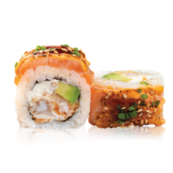 Karai padažas, keptos tigrinės krevetės, laiškinis česnakas, lašiša, avokadas, sezamai, sūrio kremas, terijakis
