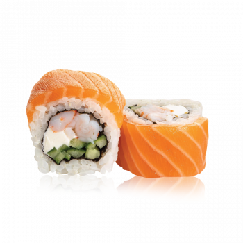 Lašiša, virtos tigrinės krevetės, agurkai, sūrio kremas