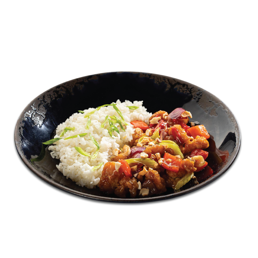 Marinuota vištienos šlaunelių mėsa, raudonieji svogūnai, paprikos, salierų stiebai, česnakai, aitrieji pipiriukai, KUNG PAO padažas, anakardžių riešutai, svogūnų žaluma.