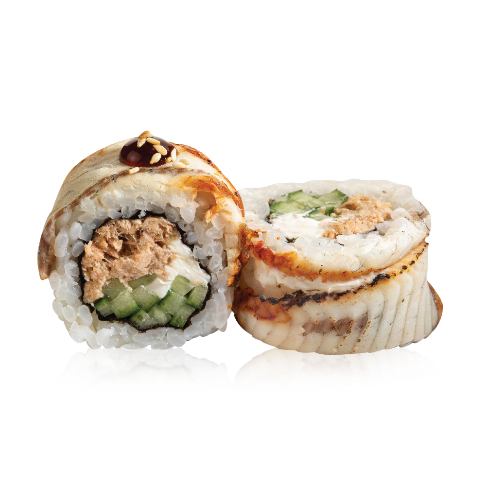 Ingredientai: Kepta lašiša, ungurys, agurkai, sezamai, sūrio kremas, terijakis