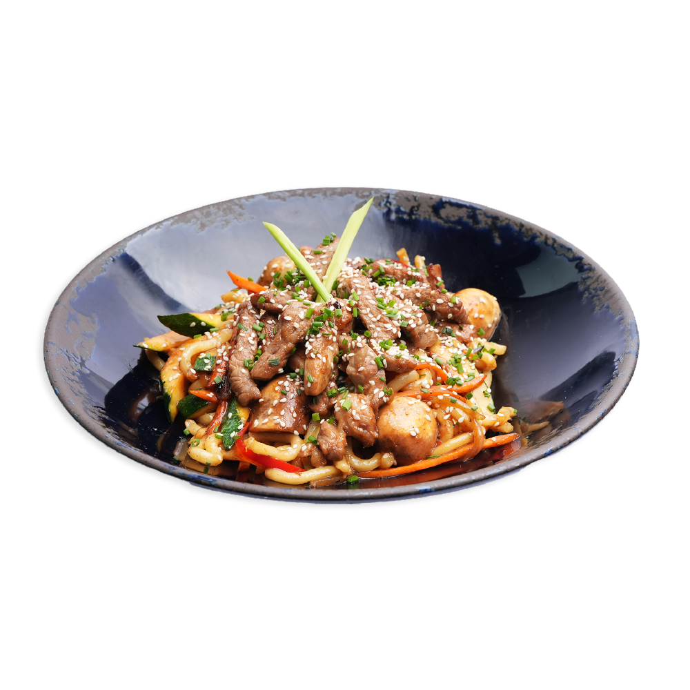 Su kepta kiaulienos sprandine, kepintomis cukinijomis, morkomis, paprikomis, svogūnais ir česnaku, pievagrybiais, baltaisiais ridikais, terijakiu, sojų padažu, laiškinio česnako žaluma, sezamu.