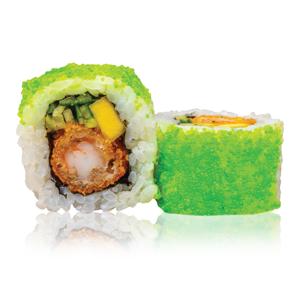 Ingredientai: Keptos tigrinės krevetės, mangai, stintenių ikrai, agurkai