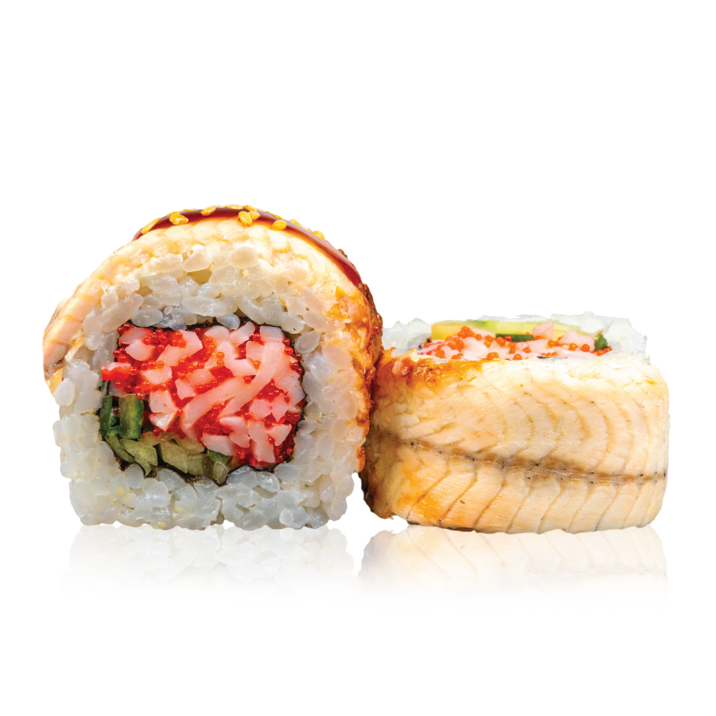Ingredientai: Keptas ungurys, krabų lazdelės, agurkai, sezamai, terijakis