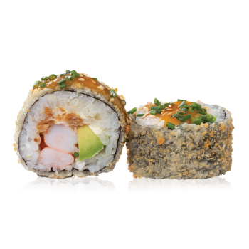 Laiškinis česnakas, virtos tigrinės krevetės, avokadas, sezamai, svogūnų traškučiai, majonezas, mangų padažas