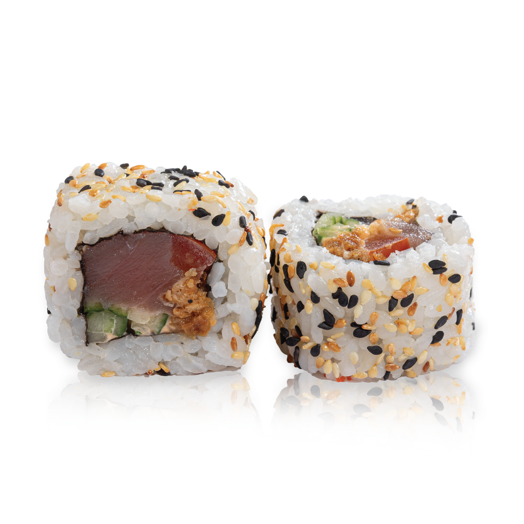 Ingredientai: Karai padažas, tunas, pomidorai, sezamai, svogūnų traškučiai, mangų padažas