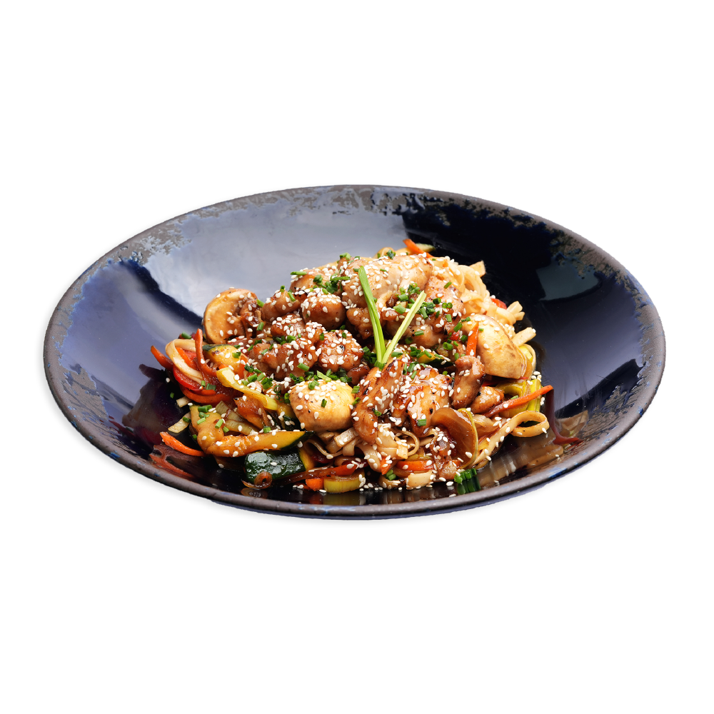 Su kepintomis cukinijomis, morkomis, paprikomis, svogūnais ir česnaku, pievagrybiais, baltaisiais ridikais, terijakiu, sojų padažu, sezamu, laiškinio česnako žaluma.