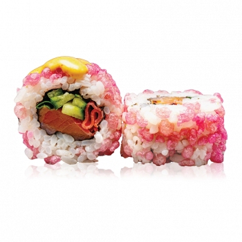 Karai padažas, laiškinis česnakas, mangai, rūkytas šamas, svogūnų laiškai, avokadas, sezamai, sūrio kremas, terijakis
