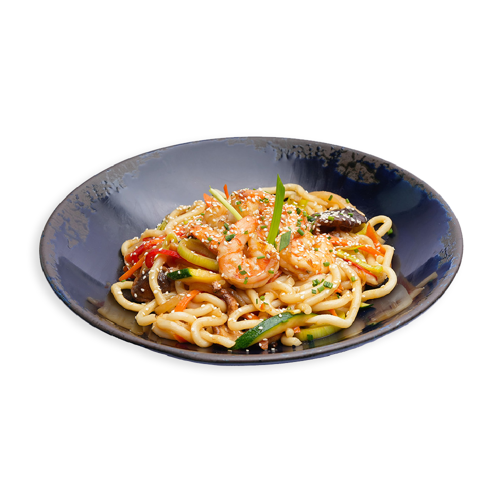 9. WOK SU KREVETĖMIS, saldžiarūgščiu padažu ir kvietiniais makaronais