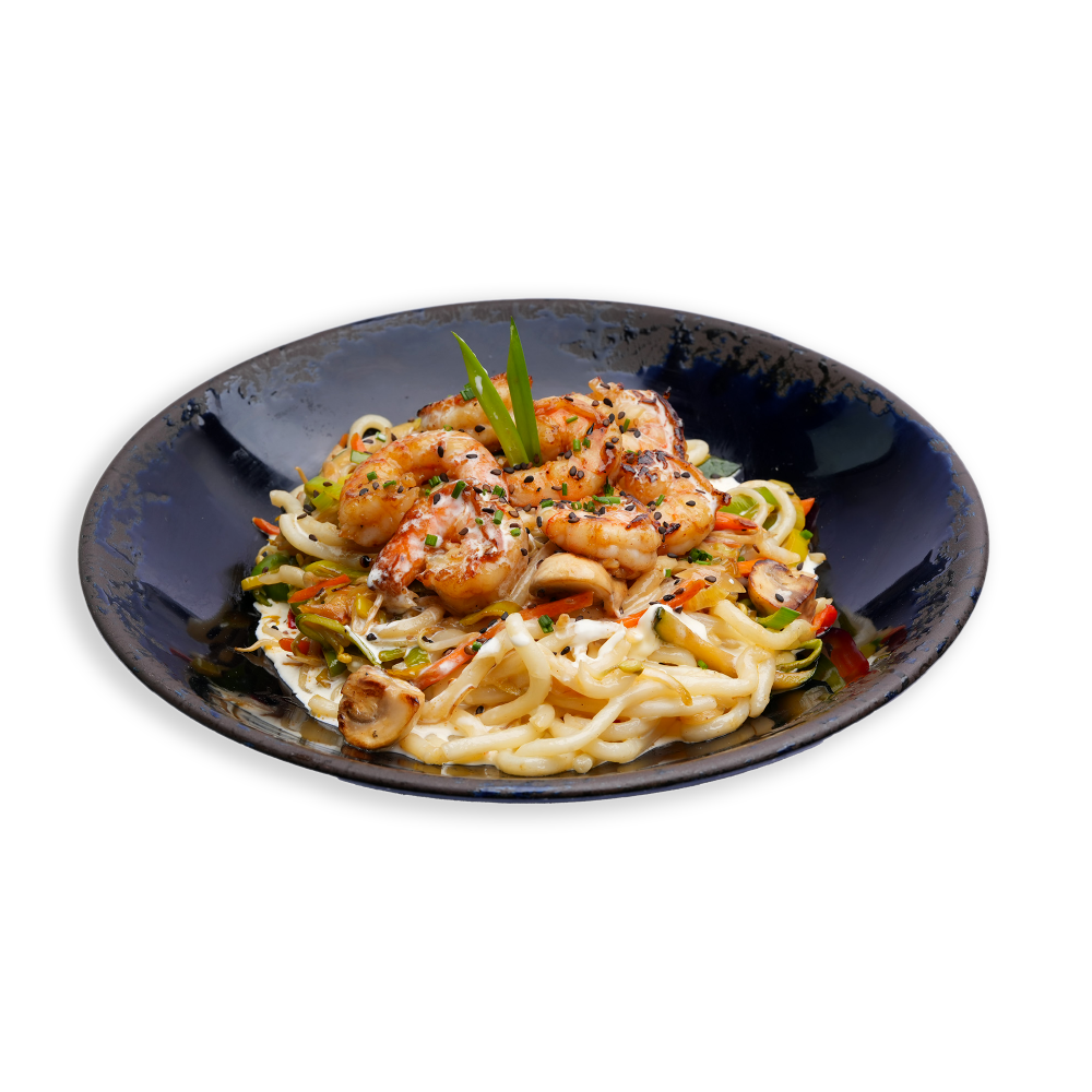 10. WOK SU KREVETĖMIS, grietinėlės padažu ir kvietiniais makaronais