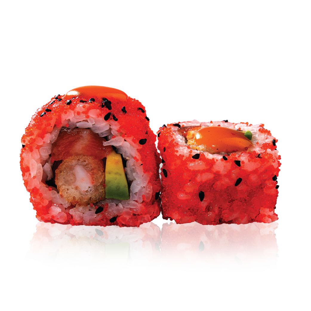 Keptos tigrinės krevetės, Lašiša, Stintenių ikrai, Avokadas, Mangų padažas