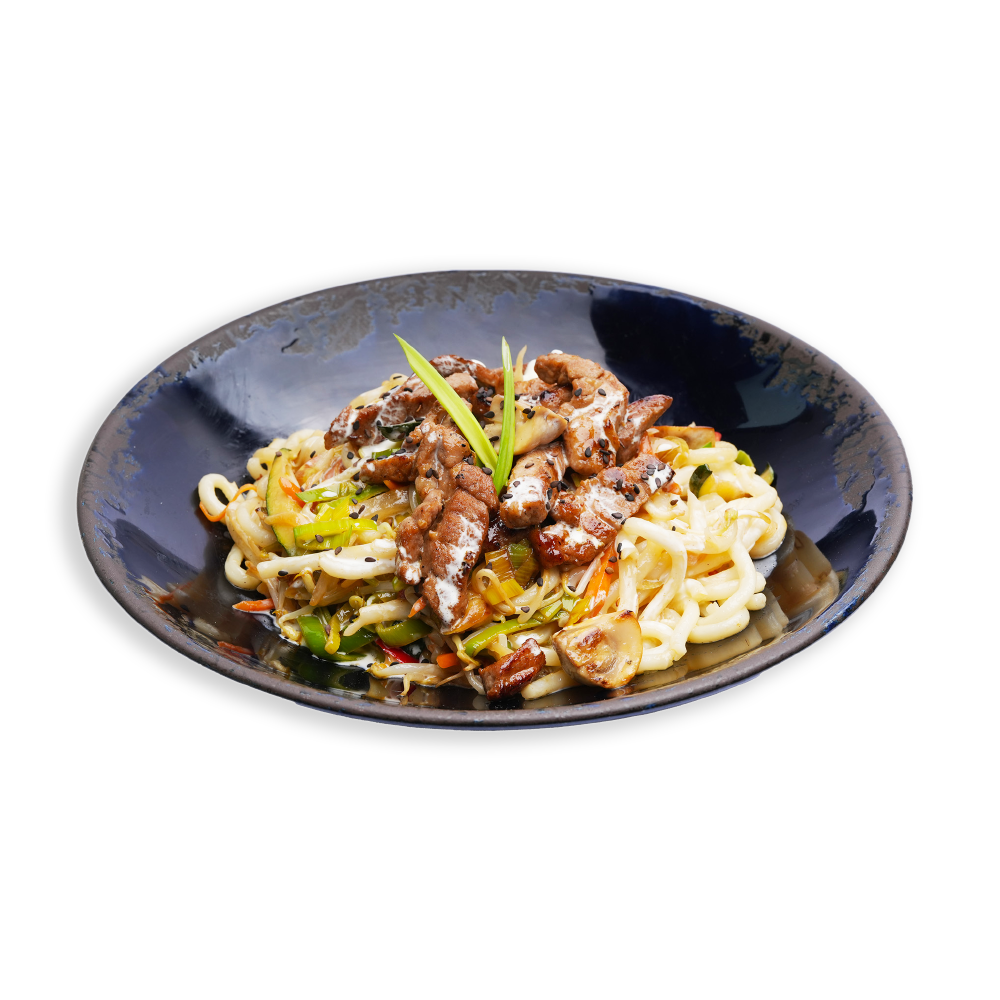 Su kepintomis cukinijomis, morkomis, paprikomis, svogūnais ir česnaku, pievagrybiais, baltaisiais ridikais, terijakiu, sojų padažu, laiškinio česnako žaluma, sezamu.